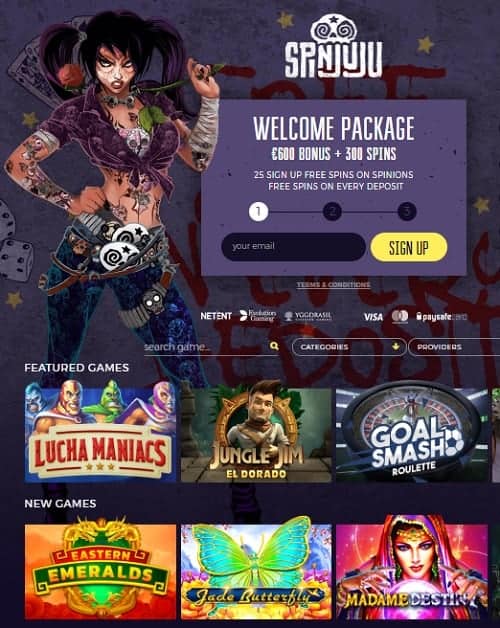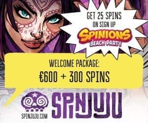 Have you tested this casino yet? Do you like it? Want to win real money? If you answered YES to one of the questions, we invite you to SpinJuju Casino welcome bonus. First off, play 25 free spins on Spinions video slot. The free spins don't require a deposit, and you can play for free and win real money. The second part of the welcome bonus is a whopping 425% bonus up to $/€600 and 300 free spins that are given in 5 installments: